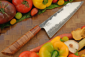 Super Gold II (SG2) powdered metallurgical (PM) steel is combined with the beauty of damascus cladding. A high performing Takefu SG2 PM stainless steel core is surrounded by thin layers of stainless damascus steel. The resulting cutting edge is tempered to Rc 62 - 63 (very hard!) for exceptional edge holding, but is easy to sharpen due to the small grain structure. The incredibly small crystalline size of this PM steel results in superior edge holding when compared to nearly any other stainless steel used in the knife industry.
