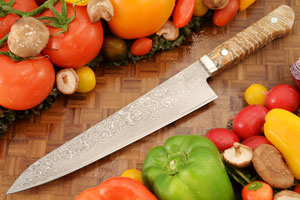 Super Gold II (SG2) powdered metallurgical (PM) steel is combined with the beauty of damascus cladding. A high performing Takefu SG2 PM stainless steel core is surrounded by thin layers of stainless damascus steel. The resulting cutting edge is tempered to Rc 62 - 63 (very hard!) for exceptional edge holding, but is easy to sharpen due to the small grain structure. The incredibly small crystalline size of this PM steel results in superior edge holding when compared to nearly any other stainless steel used in the knife industry.