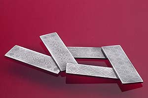 My Damascus is annealed and ready to grind. The bars are finished to 120 grit and etched. I take pride in the extra time I spend to ensure only quality bars. You will not be disappointed with my mosaic Damascus for that special project. For heat treating of my steel I strongly recommend Howard Clark. He understands the process and steel types that I work with. Contact: Howard Clark, 515-966-2126 or e-mail, howard@MVForge.com