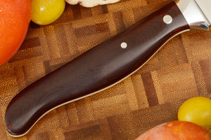 The handle is made from durable Burgundy Micarta. A 416 stainless steel bolster seals the front of the handle. The rounded handle is nicely sculpted for a secure, comfortable grip.