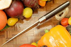 A utility knife is between a chef’s knife and a paring knife, with a narrower and straighter blade. This makes it perfect for a multitude of small tasks where more precise cuts are needed, such as trimming broccoli, green beans, or other smaller vegetables. Some cooks like to use it in their hand, too—almost like a large paring knife. Others like its smaller size as an alternative to the chef’s knife. Utility knives are sometimes called sandwich knives because they work well on almost everything that goes into a sandwich—from thin-skinned vegetables such as tomatoes, to meats and cheeses.
