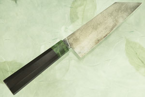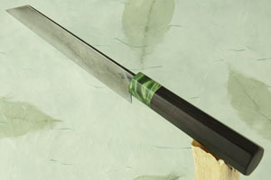The handle is inspired by the traditional Japanese octagonal handle. African blackwood (Dalbergia melanoxylon) is combined with a dyed and stabilized cottonwood (Populus deltoides) ferrule. Like other knives, this knife should not be put in the dishwasher. This ambidextrous traditional Japanese-style handle is extremely comfortable.