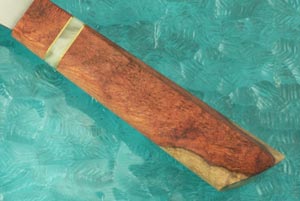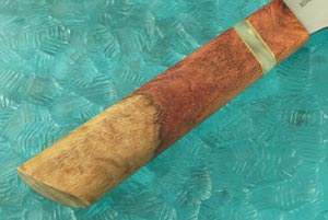 The handle is formed from amboyna burl (Pterocarpus indicus). This dramatic wood combines red heartwood with yellow sapwood in a swirling figure. A central resin spacer adds nice contrast. This Japanese-inspired handle features octagonal facets at the top and a rounded base. It is extremely comfortable. By using stabilized woods, Edward ensures this knife will hold up well to the high demands of either a professional or home kitchen.