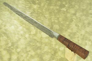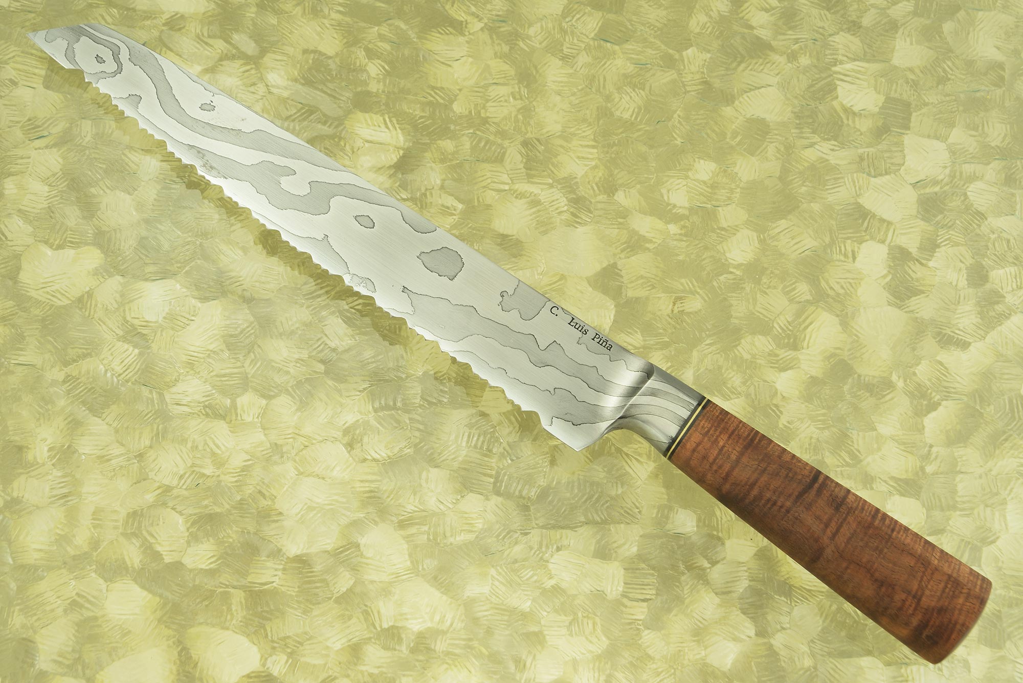 Description: Luis Pina, is an exceptional bladesmith that specializes in kitchen knives. He apprenticed under Mastersmith David Lisch. David's eye for design clearly shines through Luis' work on this tremendous bread knife. Luis' past career as a professional chef provides him with an understanding of chef's knives that is rarely found in other bladesmiths.