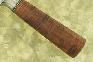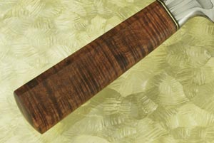 The handle is formed from curly koa (Acacia koa) wood. The presentation grade wood is particularly beautiful with a nice curly figure. The shape is inspired by traditional Japanese chef's knife handles. It is rounded at the base and features facets at the top. This style of handle is sometimes called "half octagonal". The stabilized koa wood will hold up beautifully to hard use, though this knife would feel at home in most any collection. Alternating black fiber and silicon bronze spacers assist the handle to adjust to temperature and humidity changes in the kitchen. The bolster is fully integral to the blade, with the damascus pattern moving seamlessly from bolster to blade. This technique has superior structural integrity and requires a particularly talented smith. The bolster is carved to encourage a comfortable pinch grip.