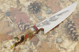 The Natural Galaxy transparent handle combines resin with natural materials. Various plants, pinecones, and a beautiful beetle are preserved in hand poured and cured resin, then shaped to create a 'looking glass into a mesmerizing journey of the natural galaxy'. The faceted handle provides a sure comfortable grip and feels comfortable whether grasped by the handle or held in a pinch grip. Red G-10 bolsters and a brass spacer finishes the handle.