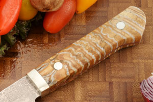 The handle is mammoth molar set on a full tang. Red fiber spacers will help the natural material adjust to humidity and temperature changes in the kitchen. The blade and tang are nicely distal tapered to provide an excellent balance in hand. A stainless steel bolster finishes the handle.