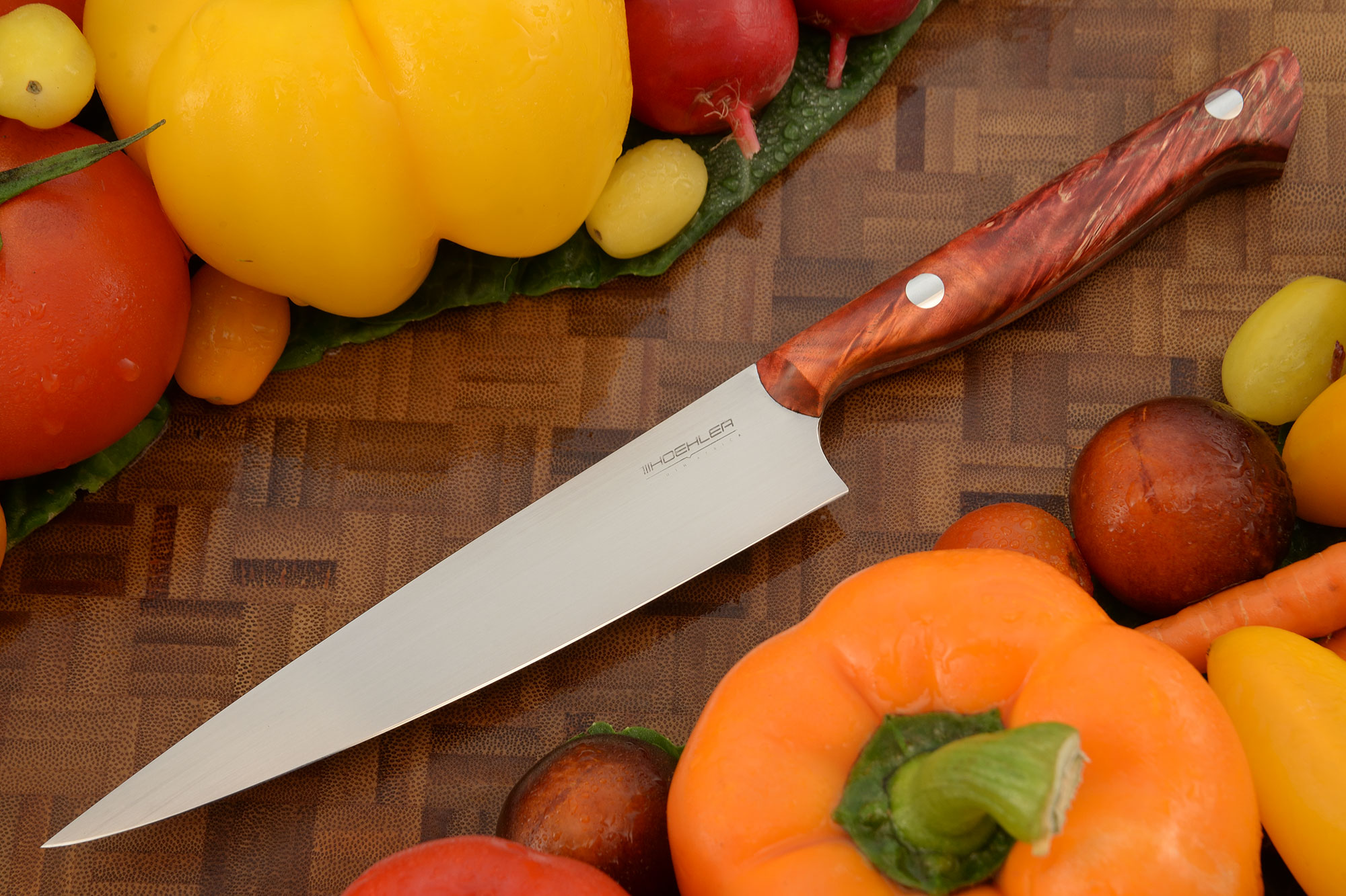 The 6-1/4 inch blade is high performing 14c28N stainless steel. This Sandvik stainless steel was specifically developed as a blade steel. It is a very fine grained alloy, ensuring a keen, long lasting edge. At Hrc 61, it offers a good combination of corrosion resistance, edge stability, wear resistance, and strength. The blade is meticulously flat ground for precise slicing and has a razor sharp edge. A hand rubbed satin finish lends an heirloom quality to the knife. The spine and choil are nicely rounded for comfort. The distal tapered blade provides perfect balance.br> The handle is dyed and stabilized maple burl. Two stainless steel hidden bolt rivets set the scales to the full tang. This elegant knife will hold up exceptionally well to the demands of either a home or commercial kitchen. Like other knives, this knife should not be put in the dishwasher.