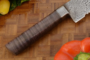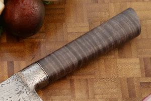The handle is curly maple. The presentation grade wood is particularly beautiful with a nice curly figure. The stabilized maple will hold up beautifully to hard use, though this knife would feel at home in most any collection. Alternating black fiber and copper spacers assist the handle to adjust to temperature and humidity changes in the kitchen. The bolster is fully integral to the blade, with the damascus pattern moving seamlessly from bolster to blade. This technique has superior structural integrity and requires a particularly talented smith. The bolster is carved to encourage a comfortable pinch grip.