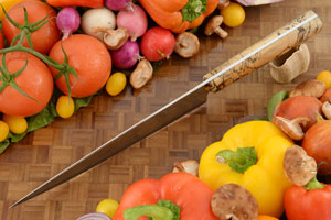 This high performance chef's knife is a perfect choice as a primary knife in the kitchen. The long, deep-bellied blade is well suited as a general purpose chef's knife. Whether slicing, chopping, mincing, or dicing, this comfortable knife will do it all. The gentle arc of the cutting edge is perfect for a rocking chopping motion with plenty of finger clearance over a cutting board.