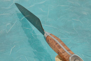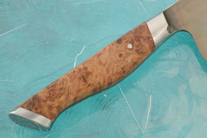 The faceted handle is Oregon bigleaf maple burl (Acer macrophyllum). It is set between the integral bolster and integral end cap. By using stabilized wood, STEELPORT ensures this knife will hold up well to the demands of either a home or commercial kitchen. The integral bolster provides a smooth transition to the rounded spine for an effortless pinch grip. The handle is comfortable in a wide range of grips.