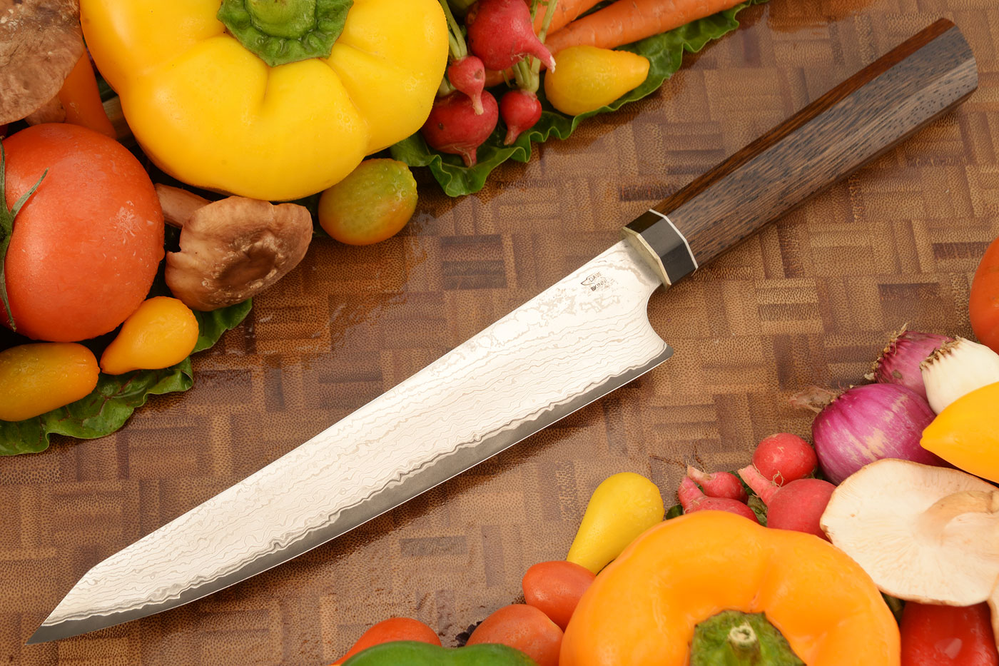 The frame-constructed handle is inspired the Japanese ambidextrous octagonal handle. The stabilized Angelim Pedra has a dramatic straight grain figure and will hold up well to the demands of a professional kitchen. A black G-10 spacer and nickel silver bolster seal the handle from water. Like other knives, this knife should not be put in the dishwasher.