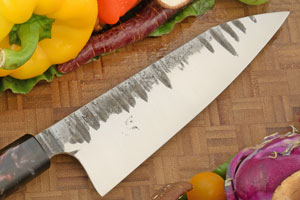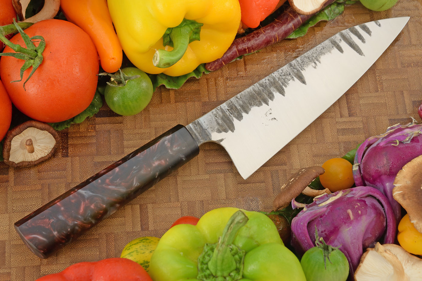 The ambidextrous Japanese-inspired half octagonal handle is faceted at the top and rounded at the base. This shape is among the most comfortable of traditional Japanese handle styles. The handle is a material Martin called Huberite - a sturdy and dramatic home-made acrylic resin. The knife has perfect balancce. It is a knife you won't want to put down! Like other knives, this knife should not be put in the dishwasher.