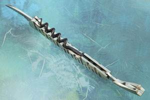 The blade is mirror polished, serrated stainless steel to make cutting foil on bottles a breeze. Koji's touchmark is on the left side of the blade. The corkscrew featuers a black finish. The frame is mirror polished and meticulously inlaid with 38 sections of abalone. This emulates the shining scales of the giant fish this knife gets its name from. Only fifty of these limited edition wine openers were made. This is number 3.