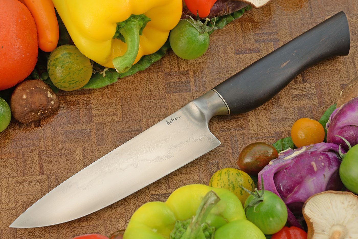 The blade is hand forged W2 carbon steel and features a meticulous hand rubbed satin finish. Andrea borrowed her heat treatment technique from the world of Japanese swords. The spine was coated with clay prior to quenching. This resulted in a softer, supportive spine, with an ultra-hard, keen, long lasting edge. The blade is beautifully thin with a nice distal taper for clean, perfect cuts. A convex grind assists food to release from the blade while slicing. This is among the first knives that Andrea made after she passed her journeyman smith test. Andrea's touchmark is on the left side of the blade. Her new "A. Lisch JS" mark is on the right side. Because the blade is forged from carbon steel, we recommend using camellia oil to protect the blade and natural wood handle.