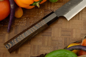 The Super Gold 2 stainless steel core (hagane) is surrounded by softer stainless steel cladding. At 63 Hrc, SG2 powdered metallurgical stainless steel offers a keen, long lasting edge without the care of carbon steel. Though the cutting edge is very hard, the small grain structure of SG2 makes sharpening and honing effortless. In our experience, SG2 is one of the best stainless steels currently being used to make kitchen knives. The ambidextrous shinogi grind provides effortless food release while chopping and slicing. Hand hammered texture at the top of the blade (tsuchime) and a forge finish (kurouchi) limit a suction forming between the food being cut and the knife. The spine and choil are nicely rounded for a comfortable pinch grip.