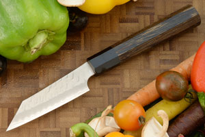 The Super Gold 2 stainless steel core (hagane) is surrounded by softer stainless steel cladding. At 63 Hrc, SG2 powdered metallurgical stainless steel offers a keen, long lasting edge without the care of carbon steel. Though the cutting edge is very hard, the small grain structure of SG2 makes sharpening and honing effortless. In our experience, SG2 is one of the best stainless steels currently being used to make kitchen knives. The ambidextrous shinogi grind provides effortless food release while chopping and slicing. Hand hammered texture at the top of the blade (tsuchime) limits a suction forming between the food being cut and the knife. The spine and choil are nicely rounded for a comfortable pinch grip.