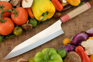 Description: Longer than the santoku, the kiritsuke gyuto is the essential kitchen knife and is used for all-around food preparation. The gyuto has less curve than a Western chef's knife, which means it contacts the cutting board along more of its length, so more food is cut per slice and it needs to be lifted less, making cutting more efficient. The arc of the blade edge is perfect for a rocking chop. The slim profile keeps the weight low and the balance just right. The K-tip provides a precise, detail-oriented tip. Whether slicing, chopping, or dicing, this nimble chef's knife is a perfect choice.