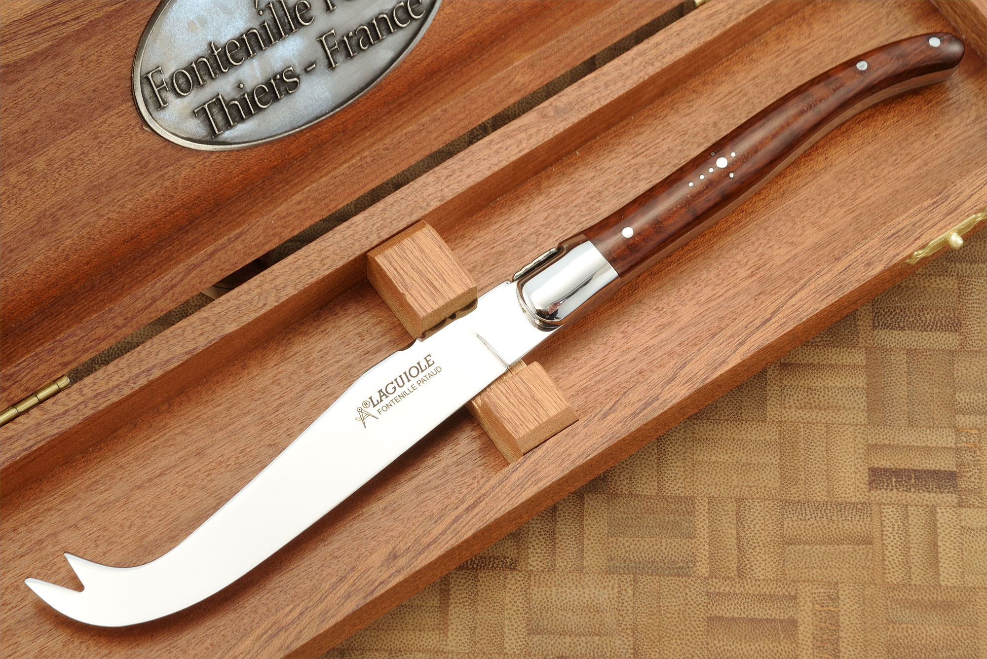 This beautiful cheese knife is expertly crafted. The blade is hand forged and hand finished, and features both a keen edge for slicing cheese and a forked tip for picking it up. The signature shepherd’s cross is inlaid into the snakewood scales, and the traditional Laguiole bee is solid steel and forged into the spine. The whole spring, bee, and part of the knife spine are hand chased with a file in a pattern unique to the knife. The snakewood scales are accented with brushed stainless steel bolsters.