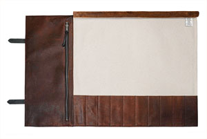 The roll is handcrafted from 4 oz full grain oil-tanned leather with 11-1/2oz cotton canvas backing. The handle and straps are 8oz full grain bridle leather set with copper rivets.