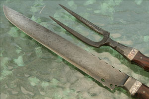 The fork and blade are matching heat colored damascus, forged from carbon steels to ensure excellent edge holding and chip resistance. The blade is a san mai, with the damascus surrounding a carbon steel core. Both the fork and blade culminate in integral carved bolsters. Handle scales are carved rosewood set with silver pins. They are surrounded by antiqued mokume gane spacers. The distal tapered full tangs are hand fileworked.