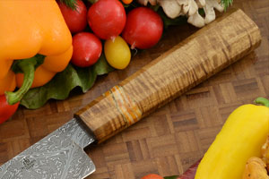 The Japanese-inspired octagonal handle features premium curly koa with a tight curly figure. Koa (Acacia koa) is a beautiful exotic wood that only grows on the Hawaiian islands. It is one of the most desirable woods in the world. A central spacer is ancient woolly mammoth tooth. The handle fills your hand nicely and is equally comfortable for either left or right-handed users. This is a knife you won't want to put down! It is sure to become a kitchen favorite.