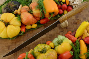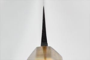 The 11-3/4 inch blade is forged from Aaron's own mosaic damascus, combining 1084 and 15N20 carbon steels for excellent edge holding and chip resistance. Many thermal cycles and normalizing steps ensure consistent grain structure. Triple tempering at 400 degrees results in exceptional durability and strength. A cryogenic treatment between temper cycles enhances edge holding ability. The deeply etched blade helps release food from the side. The blade is distal tapered from the heel into a high-performance thin tip. Aaron's touchmark is on the left side of the blade.