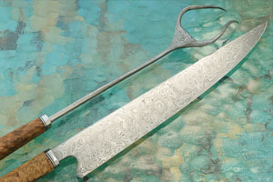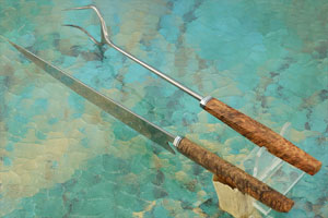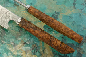 The 12 inch damascus blade was hand forged from 1080 and 15N20 carbon steels to ensure excellent edge holding and chip resistance. The damascus combined alternating high layer and low layer count damascus for a particularly captivating effect. The bold pattern grabs attention from a distance while the fine patterns demand closer inspection. The blade was brought to a high polish for an elegant, dramatic appearance. The spine and choil are rounded for comfort. A distal taper in the blade provides perfect balance despite the long blade. The carving fork is forged from matching damascus and tapers into elegant tips perfect for piercing even the toughest meats. Because the blade and fork are forged from carbon steels, we recommend using camellia oil to prevent rust.