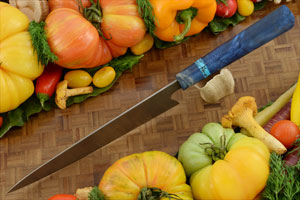 The Japanese-inspired oval handle is dyed and stabilized maple. A turquoise Tru-stone spacer complements the maple handle well. Like other knives, this knife should not be put in the dishwasher.