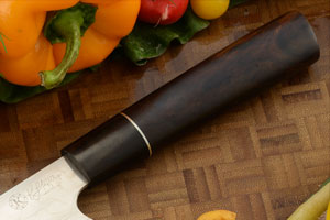 The Japanese-inspired oval handle combines Arizona desert ironwood with an African blackwood bolster. Desert ironwood (Olneya tesota) is a rare wood that is only found in the valleys of the Sonoran Desert below 2,500 foot elevation. It is extremely dense and durable. In fact, it is so dense, that if a piece is dropped in water it will sink! The handle nicely accommodates a comfortable pinch grip. This is a knife you won't want to put down. Like other knives, this knife should not be put in the dishwasher.