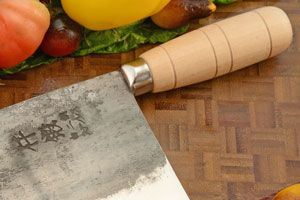 This Chinese cleaver by Hatsukoro-Sentan is hand forged san mai. The Japanese Shirogami #2 carbon steel core is clad in layers of softer stainless care -- imparting increased strength and durability while easing care and maintenance. Shirogami #2 carbon steel ensures a keen edge that is also easy to sharpen. The blade features a kurouchi finish (forge finish) and moves into a satin finished convex ground cutting edge.