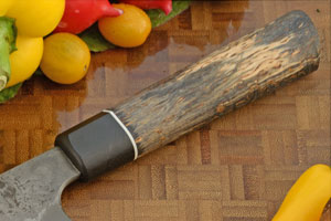The ambidextrous Japanese-inspired half octagonal handle is faceted at the top and rounded at the base. This shape is among the most comfortable of traditional Japanese handle styles. The handle combines dyed and stabilized birch with a bog oak ferrule. The bog oak was buried in a peat bog for hundreds or sometimes thousands of years. The extremely low oxygen conditions of the bog protect the wood from normal decay, while the underlying peat provides acidic conditions where iron salts and other minerals react with tannins in the wood, gradually giving it a distinct dark brown to almost black color. A contrasting white G-10 spacer finishes the handle. Like other knives, this knife should not be put in the dishwasher.