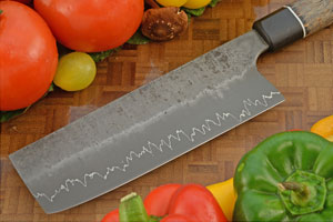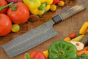 The nakiri is a multipurpose knife. It is a traditional Japanese knife ideal for chopping and slicing fruits and vegetables. The edge is double beveled, like a Western knife. Though sometimes called a vegetable cleaver, the thin edge geometry makes it a precision tool, rather than a Japanese equivalent to meat cleavers. Nakiri make fast, accurate work of thin slicing and chopping. This nakiri is particularly tall, giving it a nice combination of nimbleness and lots of knuckle clearance over the cutting board.