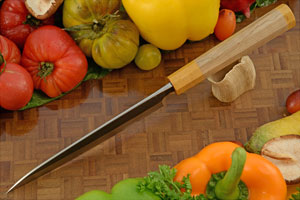 Description: A slicing knife is between a chef’s knife and a paring knife, with a narrower and straighter blade. This makes it perfect for a multitude of small tasks where more precise cuts are needed, such as trimming broccoli, green beans, or other smaller vegetables. Some cooks like to use it in their hand, too—almost like a large paring knife. Others like its smaller size as an alternative to the chef’s knife. Utility knives are sometimes called sandwich knives because they work well on almost everything that goes into a sandwich—from thin-skinned vegetables such as tomatoes, to meats and cheeses.