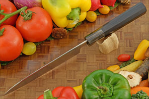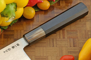 The octagonal "Wa" style handle is ambidextrous. Ebony wood is combined with a blond buffalo horn ferrule. Like other kitchen knives, this knife should not be put in a dishwasher.