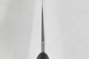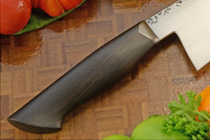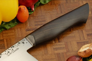 The handle is African blackwood sculpted to provide a comfortable grip. African blackwood is one of the densest woods in the world and is highly prized for its almost jet black appearance. The front of the handle is sealed with a blackened 1018 steel bolster. The handle is slim and lightweight, yet extremely comfortable. Like other knives, this knife should not go in the dishwasher.
