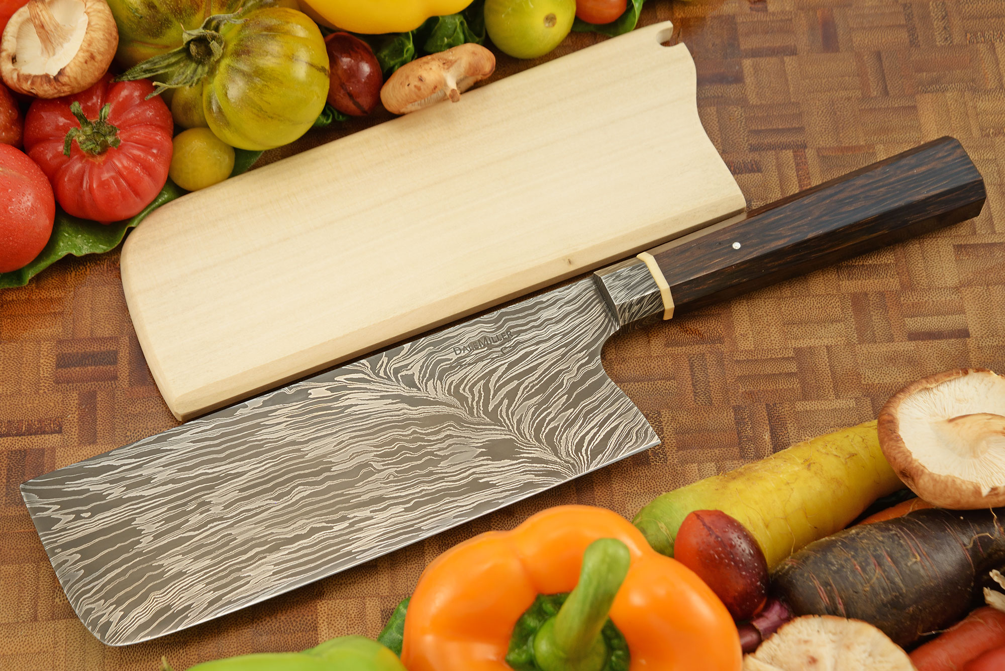 Miller's attention to detail shines through this elegant kitchen knife. The blade was hand forged to shape from Dale's own feather pattern damascus, incorporating 1080 and 15N20 carbon steels. The pattern moves from the cutting edge to the spine instead of the more typically seen heel to tip. The high contrast pattern immediately grabs attention and ensures a keen, long lasting edge. Because this knife is forged from carbon steels, we recommend using camellia oil to avoid rust and oxidation.