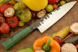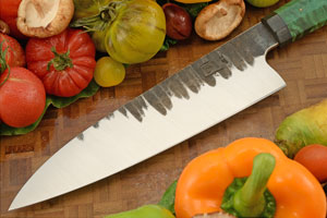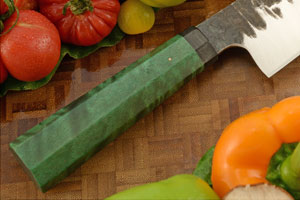 The Japanese-inspired octagonal handle is green dyed and stabilized curly maple. The ambidextrous handle is lightweight and provides a comfortable grip. The front of the handle is sealed with a black Micarta ferrule. Like other knives, this knife should not be put in the dishwasher.