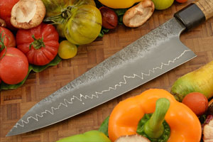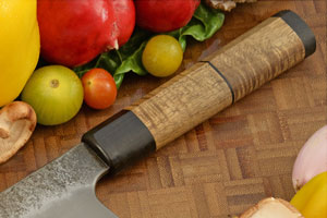 The ambidextrous Japanese-inspired half octagonal handle is faceted at the top and rounded at the base. This shape is among the most comfortable of traditional Japanese handle styles. The handle combines curly koa with an ancient bog oak ferrule. Koa (Acacia koa) is a beautiful exotic wood that only grows on the Hawaiian Islands. It is one of the most desirable woods in the world. The bog oak was buried in a peat bog for hundreds or sometimes thousands of years. The extremely low oxygen conditions of the bog protect the wood from normal decay, while the underlying peat provides acidic conditions where iron salts and other minerals react with tannins in the wood, gradually giving it a distinct dark brown to almost black color. Like other knives, this knife should not be put in the dishwasher.