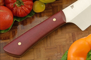 Maroon Richlite handle scales are set on the full tang for strength and durability. The hand contoured scales provide a comfortable, sure grip. Like other knives, this knife should not be put in the dishwasher.