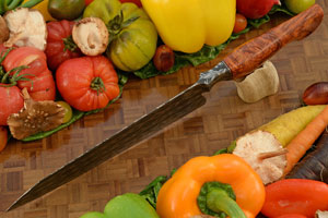 The handle is stabilized exhibition grade amboyna burl. Amboyna burl is one of the most desirable woods used in knifemaking. It is well known for its beautiful swirling figure and desirable reddish tones. It is nicely contoured for a secure, comfortable grip - swelling at the palm, moving into a slimmer waist, and swelling again at the end of the handle. This knife will remain comfortable even after hours of use. Like other knives, this knife should not be put in the dishwasher.