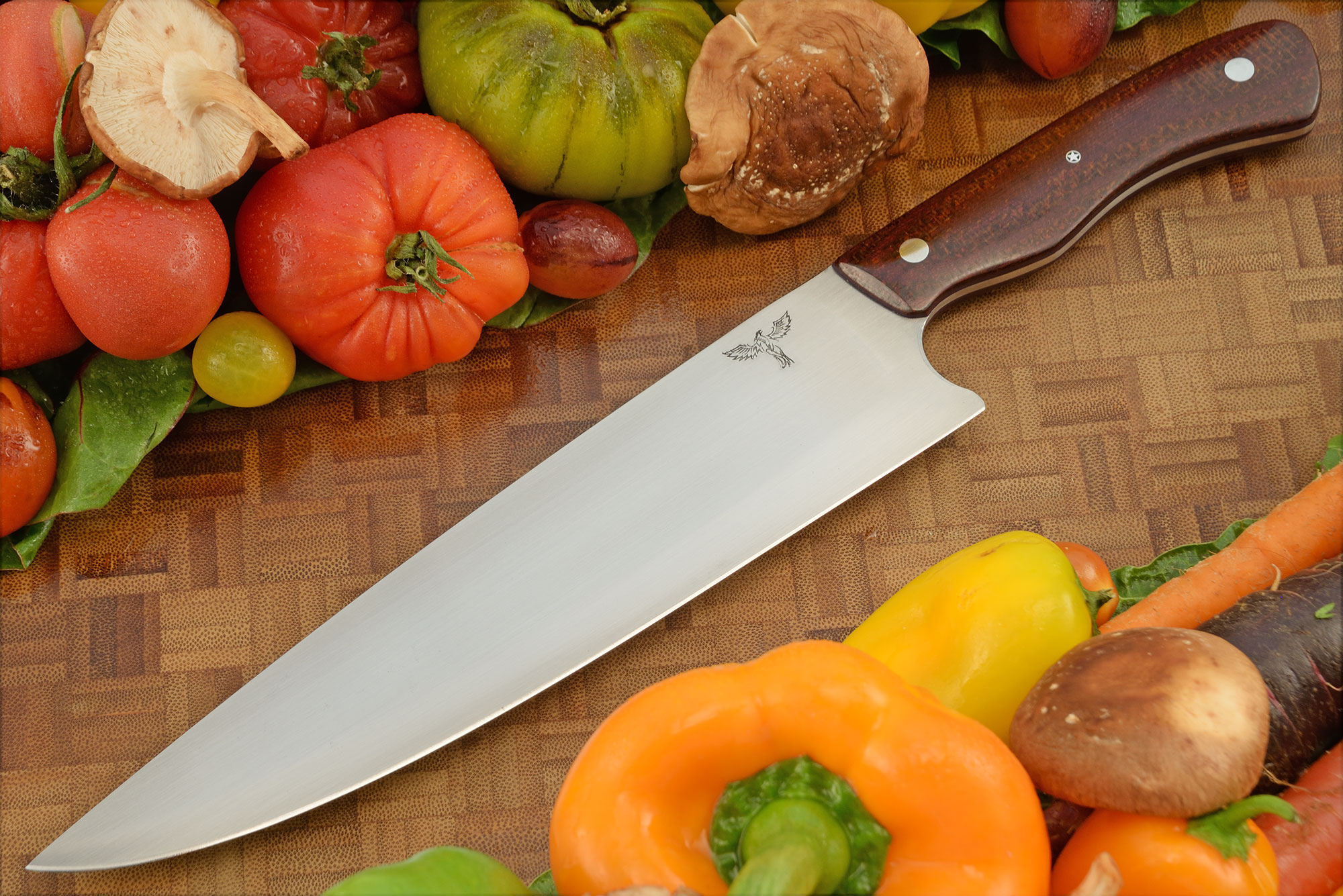 The blade is hand forged 52100 carbon steel and features a hand rubbed satin finish. 52100 is considered by many knifemakers and knife users to be among the best steels (if not the best!) used in modern knifemaking. It combines exceptional edge holding with durability and ease of sharpening. The blade features an S-Grind. A convex ground edge provides high performance chopping with lots of strength. From there, it moves into a concave as the blade moves toward the spine. This technique lightens the overall weight without sacrificing strength and provides improved food release. This combination ensures a high performing workhorse with virtually no resistance cutting through foods that would otherwise stick or wedge. Because the blade is forged from carbon steel, we recommend using camellia oil to protect the blade from rust.
