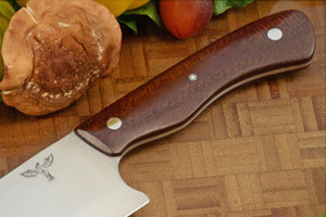 Handle scales are peanut butter and jelly burlap Micarta. The scales are hand contoured for a comfortable grip. Purple G-10 liners nicely complement the stacked scales. Like other knives, this knife should not be put in the dishwasher.
