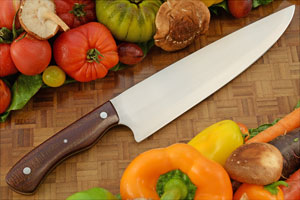 This high-performance chef's knife is a perfect choice as a primary knife in the kitchen. The long, deep-bellied blade is well suited as a general-purpose chef's knife. Whether slicing, chopping, mincing, or dicing, this comfortable knife will do it all. The gentle arc of the cutting edge is perfect for a rocking chopping motion.