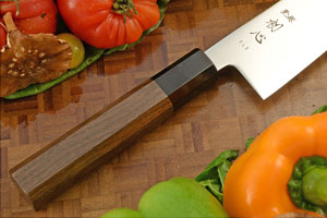 Description: The santoku is the traditional Japanese general purpose chefs knife. This comfortable design is a fantastic multipurpose chopper that has quickly become a new favorite for chefs in the West. The shorter blade is easily controlled, while the blade height gives plenty of finger clearance over a cutting board. Whether slicing, chopping, or dicing, this nimble chef's knife is a perfect choice.