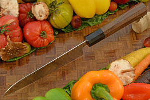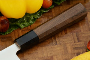The octagonal "Wa" style handle is ambidextrous. The natural walnut wood handle culminates in a black buffalo horn ferrule. Like other kitchen knives, this knife should not be put in a dishwasher.