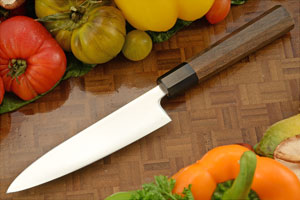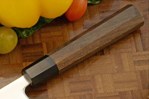 The octagonal "Wa" style handle is ambidextrous. The natural walnut wood handle culminates in a black buffalo horn ferrule. Like other kitchen knives, this knife should not be put in a dishwasher.