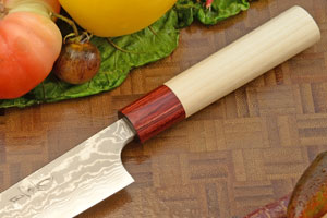 The right-handed 'D' shape handle fits comfortably and securely in the hand and is best used by a right-handed user. It is formed from ho wood, the traditional wood for Japanese handles. This wood, which is a relative of magnolia, holds up extremely well in the harsh environment of the kitchen. A dark red pakka wood ferrule adds nice contrast. Each knife is sent in a nice gift box.