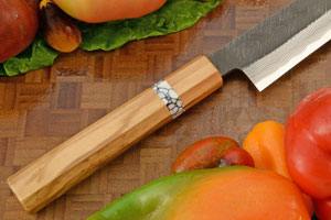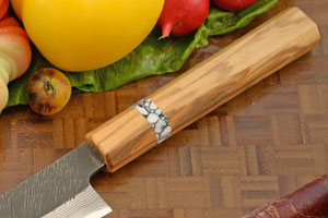 The ambidextrous handle combines olivewood and TruStone. The traditional octagonal shape is very comfortable for extended use and is a shape preferred by professional chefs.