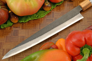 Product Description for Slicer (Sujihiki) - 9-1/2 in. (240mm) - Shirogami 2 Suminagashi, Pine Needles Tsuchime, Olivewood and TruStone Handle